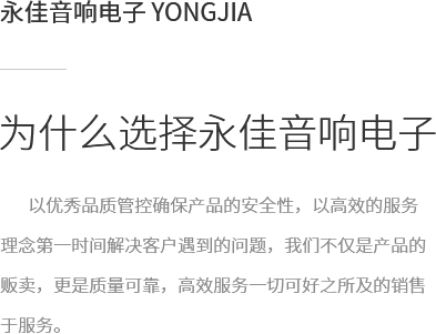 拉薩永佳音響電子有限公司 拉薩永佳音響電子有限公司坐落于美麗富饒的圣城拉薩,公司前身為拉薩昊成音響電子銷(xiāo)售有限公司,注冊(cè)資金為300萬(wàn)元,成立于2010年3月公司地址位于西藏拉薩市貢布塘南側(cè)1號(hào)薩博廣場(chǎng)4-5、4-8號(hào)。拉薩永佳音響電子有限公司主營(yíng)專(zhuān)業(yè)舞臺(tái)音響設(shè)備、會(huì)議音響系統(tǒng)設(shè)備、公共廣播音響系統(tǒng)設(shè)備、網(wǎng)絡(luò)及監(jiān)控設(shè)備、多媒體教學(xué)設(shè)備、多媒體投影機(jī)、幕布、弱電線材、辦公設(shè)備、LED液晶顯示屏品種齊全、服務(wù)效率、拉薩